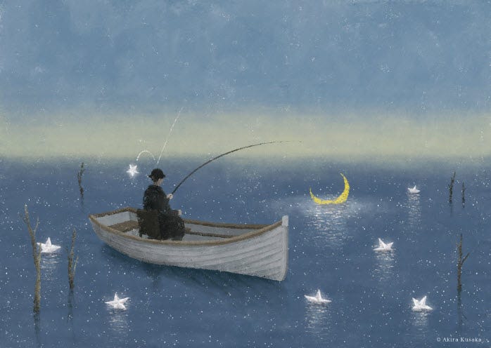 An ekphrastic poem based onAkira Kusaka's painting "Angling the Night"